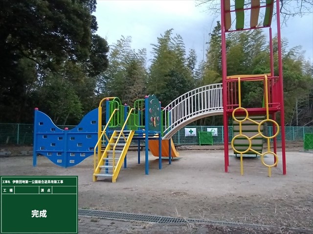 伊敷団地第一公園の複合遊具の改築工事が、無事終了いたしました。